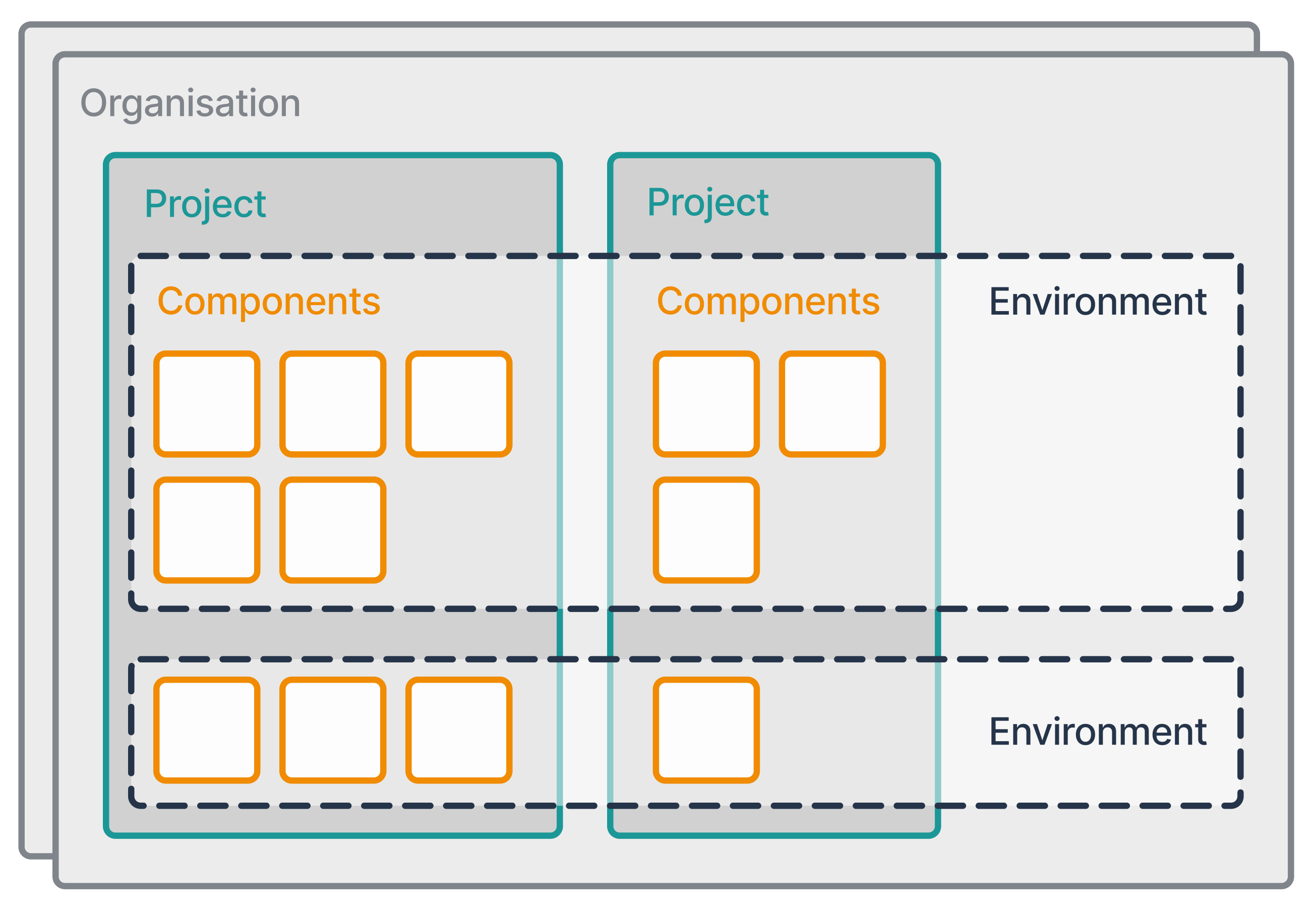 For example, an Organization may represent a company, a team, or even a large standalone application. Similarly, a Project may represent a product, an internal service, or a functional scope within a larger system. A Component may represent a single resource, a server, a shared infrastructure module, or an entire application, depending on the chosen modeling strategy.